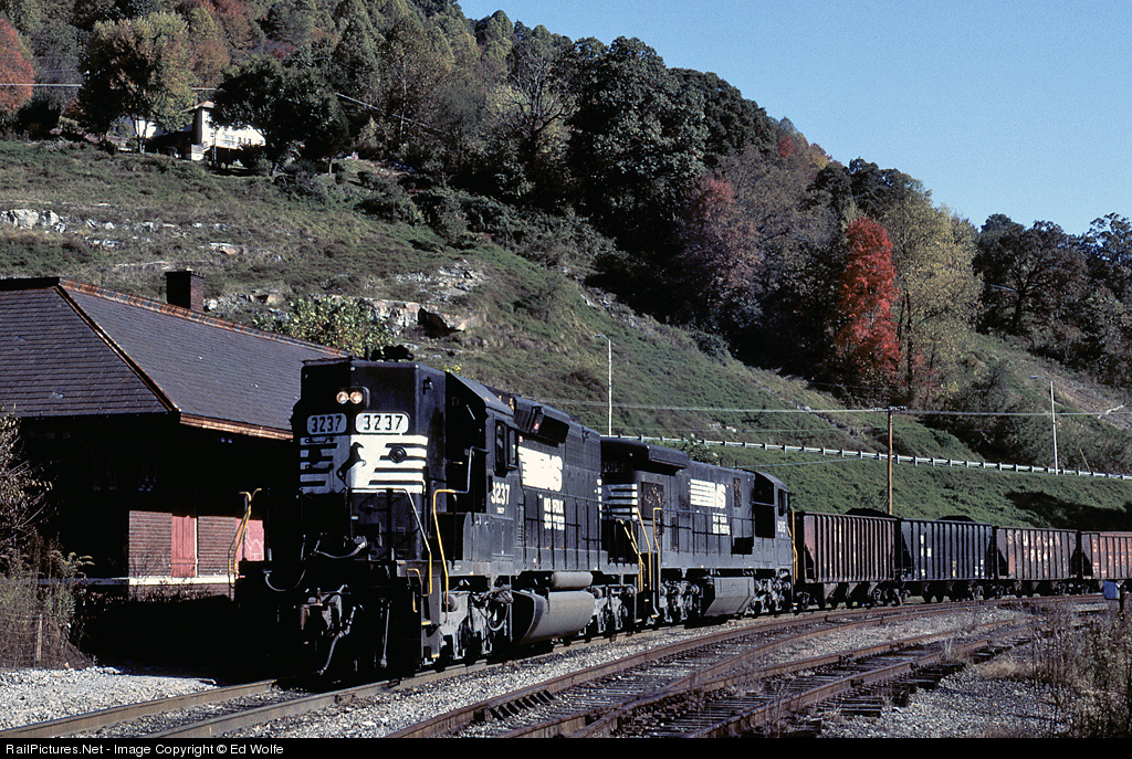 NS U52 has picked up 35 empties at Westmoreland Coal's Appalachia transloader and slowly backs around the wye (New Connection) at Appalachia. Once the headend clears the east wye witch, the crew with head to Andover and be relieved by NS U54. U54 will pick up an additional 25 empties at Andover Yard and then continue on to Wentz (Stonega) on ex-Interstate Railroad rails for loading.