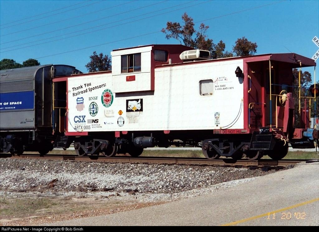 Art Train leaves Silsbee Texas thru Conroe. On end of BNSF freight. Roger Kirkpatrick shows this to be former DT&I 141 steel , wide vision. now as Artrain ARTX 0005