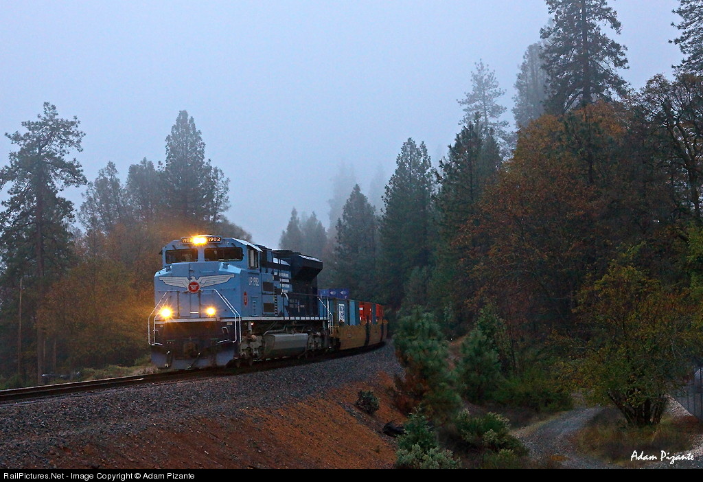 (UP) MOPAC 1982 leads an eastbound stacker up Donner Pass through thick fog with little day light left. It was nice neat to shoot 1982 as the sole lead unit.