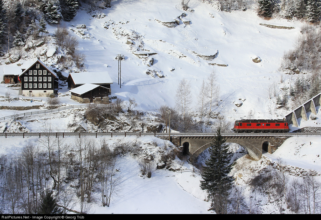 | Powerful Gotthard locomotive (7800 kW) Re 6/6 11623 "Rupperswil" is coming back from Göschenen to Erstfeld from a pusher service on a heavy freight train on the 2.6 % grade up to the Gotthard tunnel. The locomotive is crossing the Häggrigerbach bridge. |