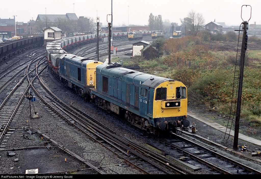 | In Warrington drizzle, 20178 & 20121 take an empty MGR from Fiddlers Ferry Power Station back to Silverdale Colliery. 178 was withdrawn in December 1989 and cut-up at MC Metals, Glasgow in May 1992. 121 was withdrawn in July 1992 and currently resides at Barrow Hill (info courtesy WNXX.com). |