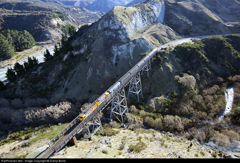 The TranzAlpine teeters across the Slovens Creek Viaduct on its journey back east under a speed restriction imposed due to aftershocks from the 7.1m Christchurch earthquake 11 days prior. Within the next half hour the train will have crossed three more viaducts and passed through more than a dozen tunnels before reaching the more sedate scenery of the Canterbury plains.