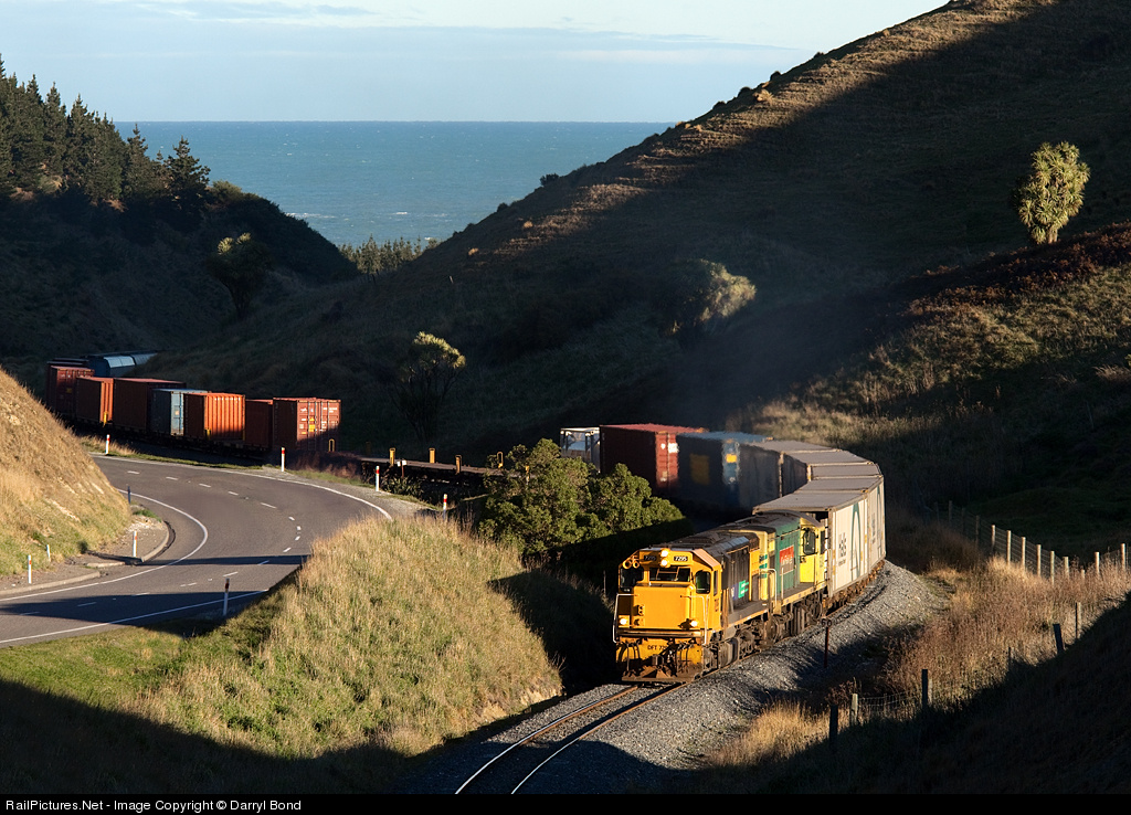 | DFT 7295 and DQ 6347 leave the coast behind as they head inland near Wharanui. The South Island's 'main north line' line between Christchurch and the rail ferries at Picton features more than an hour of coastal running around Kaikoura and this northbound train will soon be heading into the Marlborough wine growing region which is famous for its Sauvignon Blancs. Of which I am a significant consumer. Just another reason to railfan this line from time to time...! |