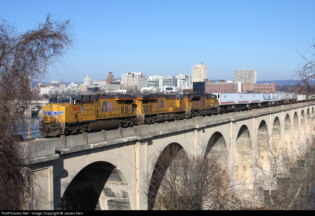 Just minutes out of its originating yard, Rutherford and with UP Power on the point, Intermodal train 203 starts its journey south towards Atlanta. Train is shown crossing the Ex Reading Philadelphia, Harrisburg & Pittsburgh bridge over the Susquehanna River. Built in 1927, it still proudly showns its heritage as evident under the lead locomotive. Recient catenary wire and pole removal on the Ex PRR Port Road Branch below has opened up this shot a lot more.