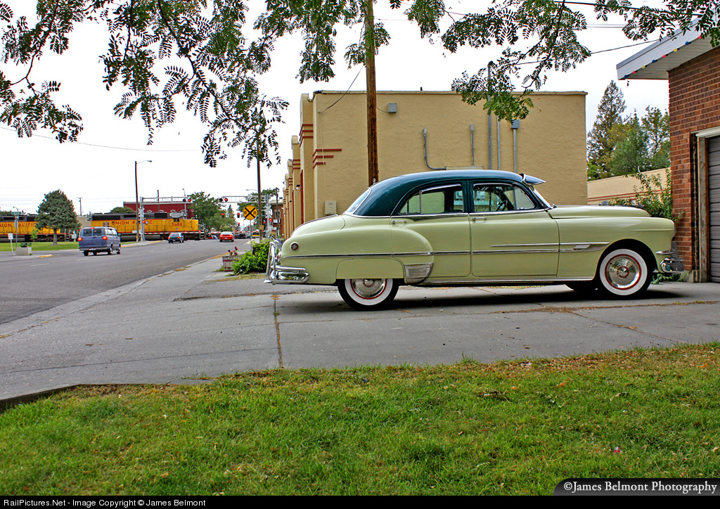 While a beautifully restored Pontiac awaits a trip to the supermarket, a Union Pacific local from Idaho Falls departs downtown Blackfoot with box cars for loading potatoes along the Montana Subdivision.