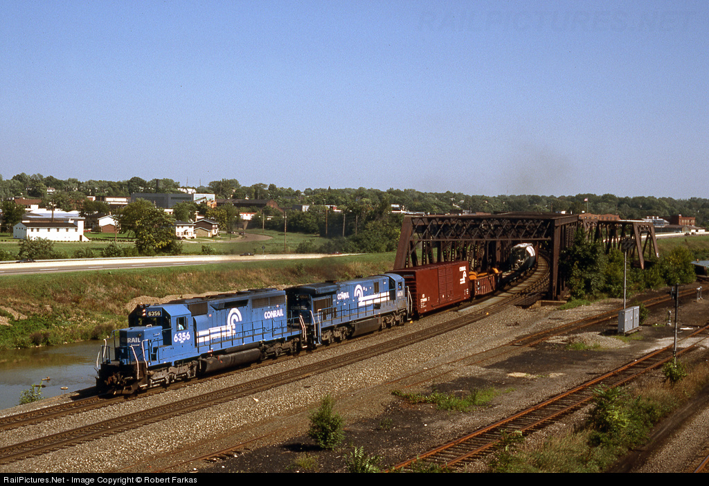 CR 6356 heads a westbound Conrail freight across the Tuscarawas River in Massillon, Ohio. So much of this photo cannot be repeated. The middle of three lines (now removed) to the right of CR crossed the innermost line and led to the ex-NKP bridge (also removed) that let then NS access a few industries in Massillon. The line closest to the CR tracks led to a steel mill. Even the signals are gone. Finally the new bridge over this site has fencing that makes this shot nearly impossible now.