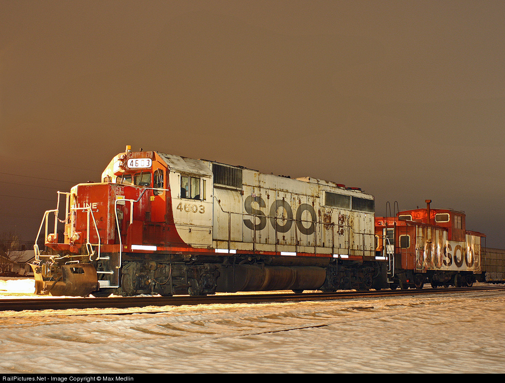 An incredible find in 2010, almost 2011, as one of two remaining SOO GP40's sits with a matching, paint and rust wise, caboose, at the Amtrak Depot on a rare night off.