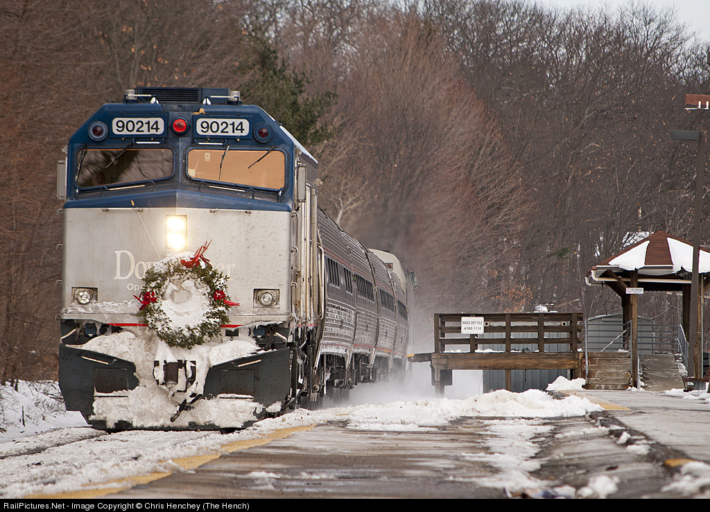 | With the Christmas wreath adorning the front of the engine, Downeaster 682 glides through Ballardvale and the snow on its way south towards Boston. |