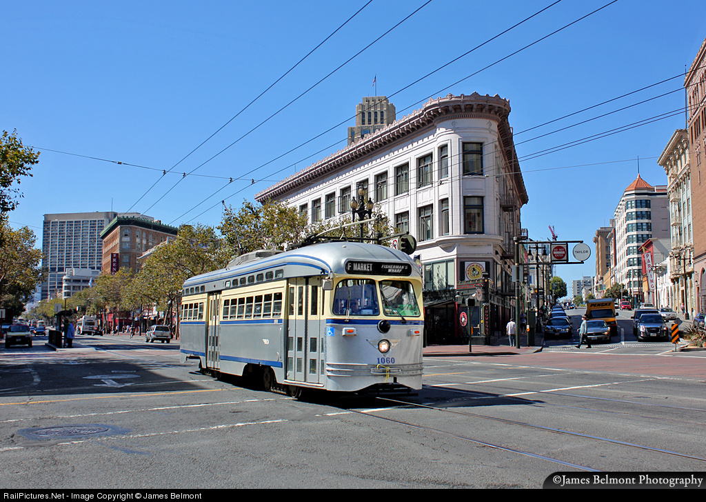 At a point where four streets come together in downtown San Francisco, PCC car 1060 rambles along Market Street at Taylor, Golden Gate, & 6th Streets. Car 1060 is painted to honor the Philadelphia Transportation Company. The silver beauty is nicknamed the 'Philly Cream Cheese' car.