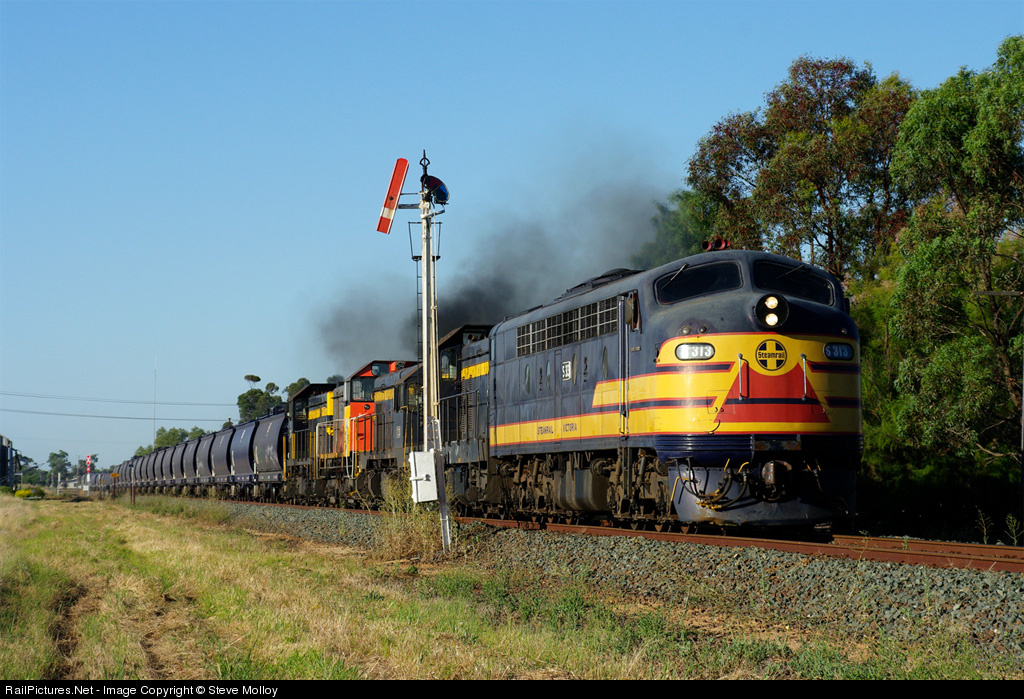 Steamrails S313 leads T357-T333-Y145-T378 on El Zorro's 9062 loaded grain from Woorinen, north of Swan Hill. The train is seen as it notches up passing the VR semaphore leaving Dingee. Thur 30/12/10