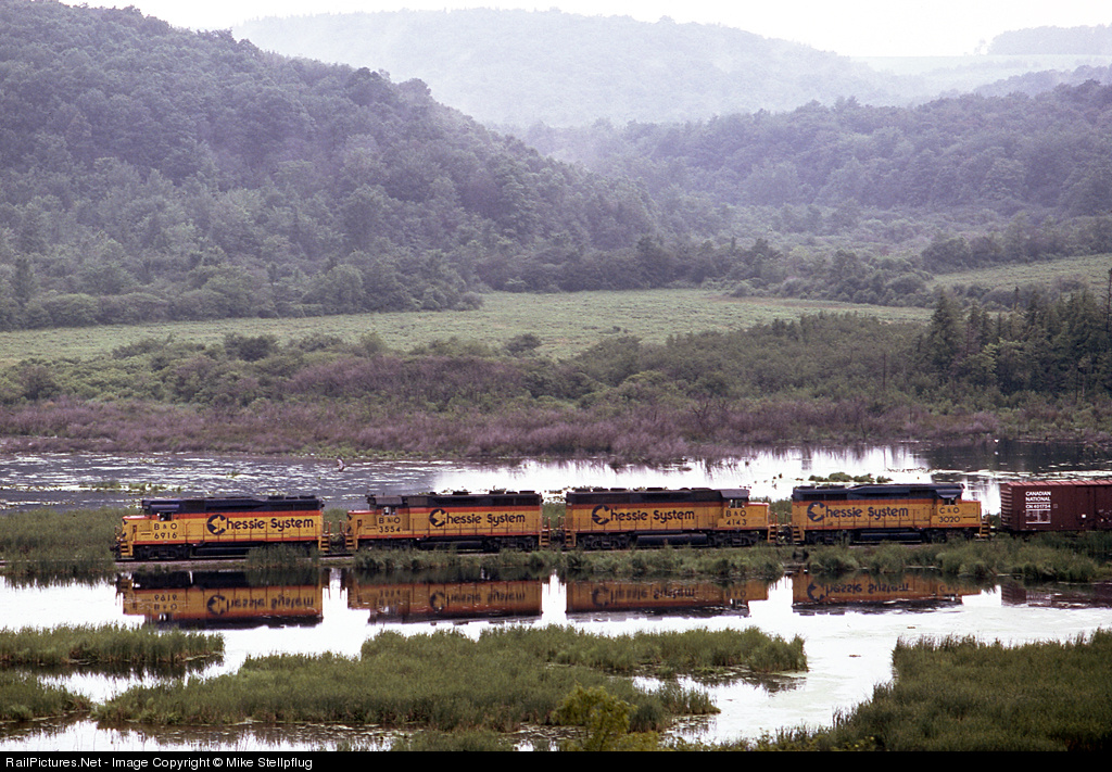 The last Chessie train on the Rochester Sub is passing thru Bird Swamp with 4 Chessie Cats. The next day this line would be the Rochester & Southern.