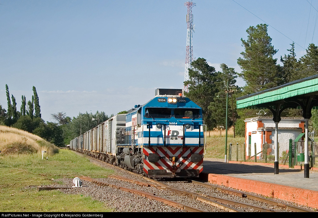 NRE E2300 #2004 with a long consist of loaded cars passing Sierra de la Ventana Station to L'Amali cement plant in Olavarria, Buenos Aires Province. The sattion of the pic was a classic Ferrocarril del Sud construction from the first decade of 20th century. The platform at right has remains of the narrow gauge departure from here to Club Hotel de la Ventana, a magnificent building now dissapeared. At left is seen the railtracks to the station depot and facilities, also abandoned.