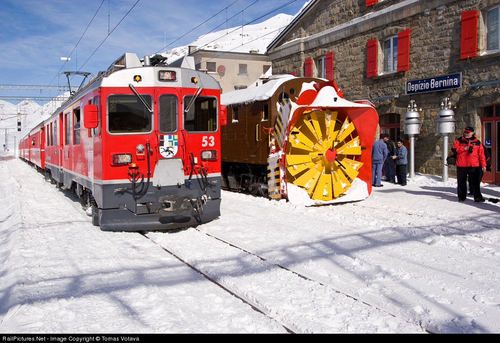 RailPictures.Net Photo: ABe 4/4 III 53 RHB- Rhätische Bahn ABe 4/4 III 53 + Xrot d 9213 at Ospizio Bernina, Switzerland by Tomas Votava