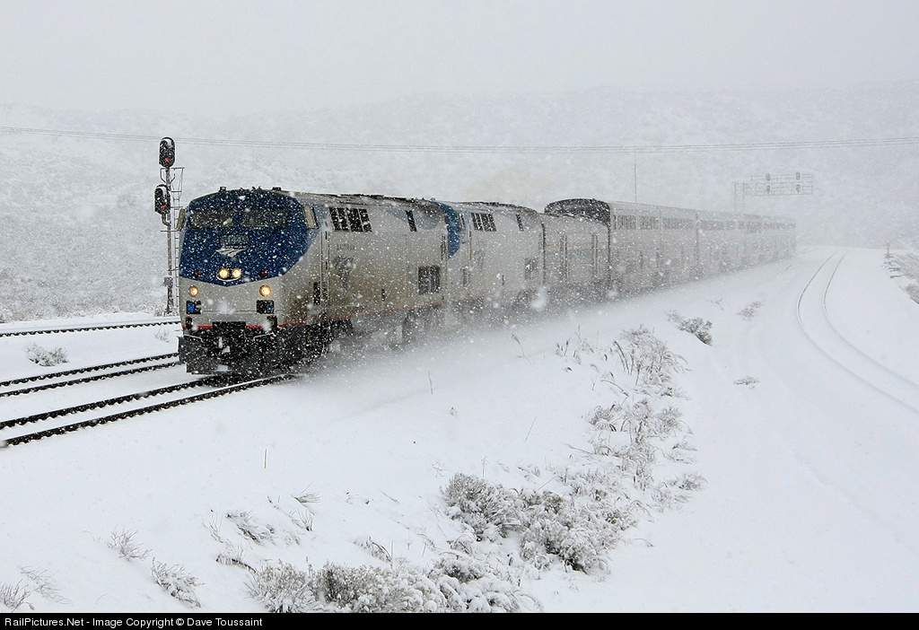 The first snow of the new year in the Cajon Pass. After waiting an hour with no trains, heavy snow started to fall as Amtrak #3 came of Cajon Summit for this dramatic image. Who says it doesn't snow in Southern California!