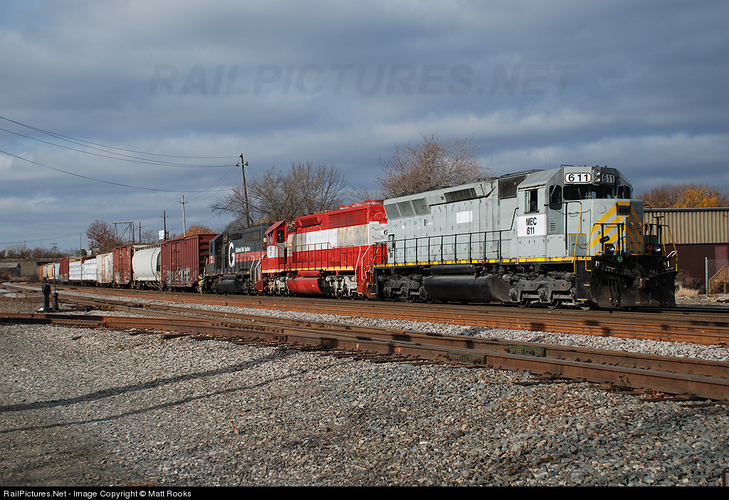 A former KCS unit now working as MEC 611 leads eastbound freight ED495 into Lowell to set some cars off. Also part of the consist is MEC 617 and MEC 316.
