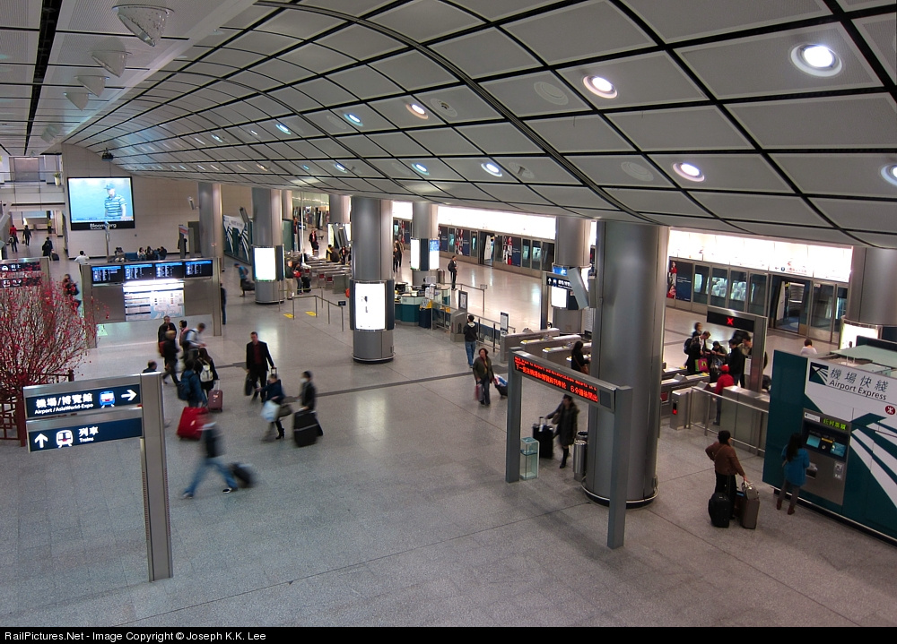 | Hong Kong Station is the city centre terminus of the Airport Express with in-town check-in facilities connecting to the Hong Kong International Airport. It has only one platform for both departure and arrival passengers. An Airport Express train has just arrived which is to depart six minutes later. |