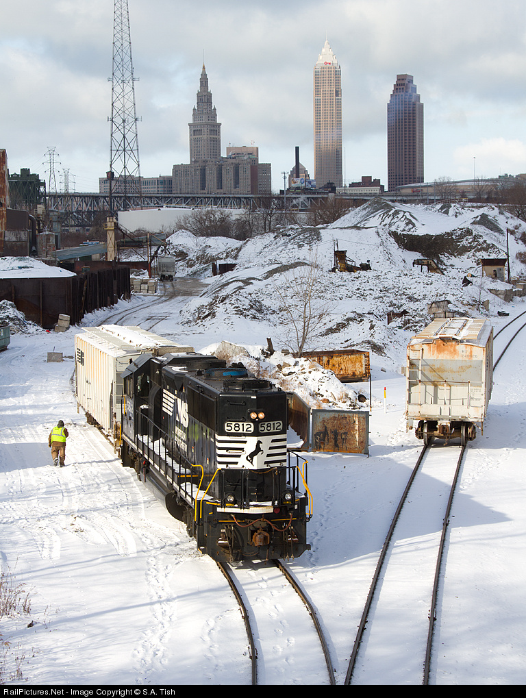 | Working a stones throw away from downtown Cleveland near the end of the Cleveland Belt Line BX90 switches Strategic Materials placing an empty hopper into their siding after removing the loaded one sitting on the main. |