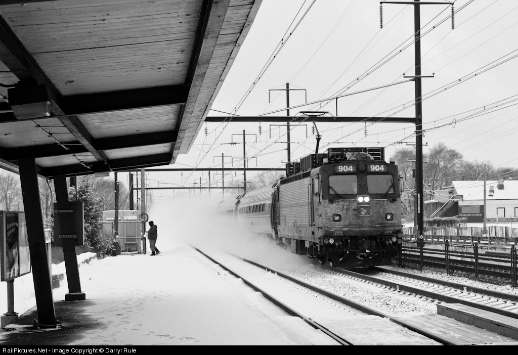 | Amtrak 904 throws up some snow as it roars through Levittown, PA headed for New York as fellow RP contributor Mitch Goldman makes a run for cover to avoid the spray. Wonder if this was a Goldman zoom-pan? |