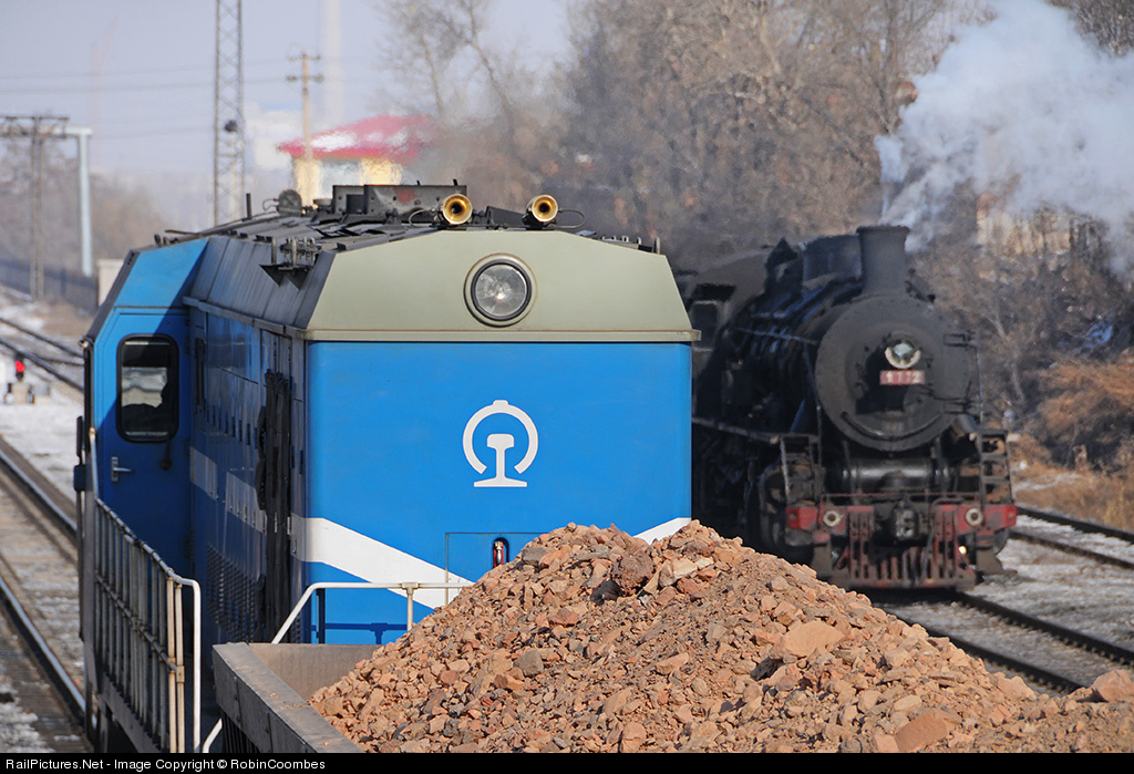 | My last upload showed two steam locos passing. this shows the transition between steam and diesel, as 0039 hauling a ballast train passes an SY Class just outside Tiefa station. Though this is slightly deceptive, the steam loco is SY1772 which was built in October 1999 and was as far as I know the last known delivery of a standard gauge steam locomotive for commercial use in the world and was just 10 years old when this was taken.(can anyone confirm) I have also no details of the diesel other than its road number of 0039, I would appreciate any further details. |