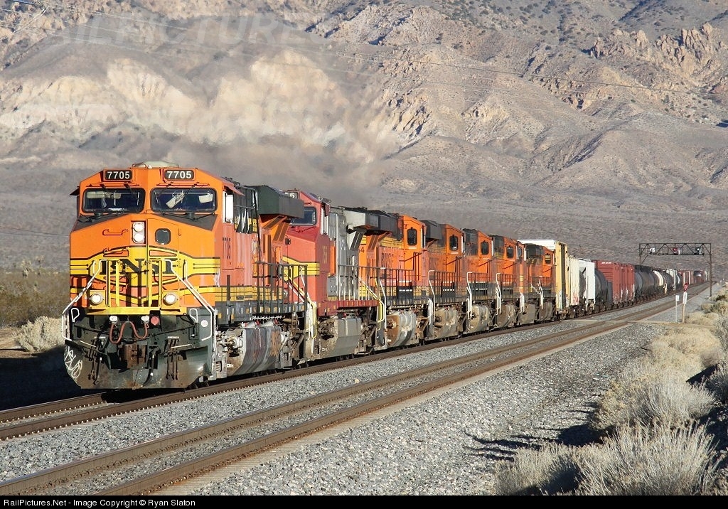 | BNSF 7705 begins the final decent into Mojave as it passes MP 377.0 with an eastbound manifest. It's battle with Tehachapi is almost over, which will soon turn into a race across the desert to Bastow. |