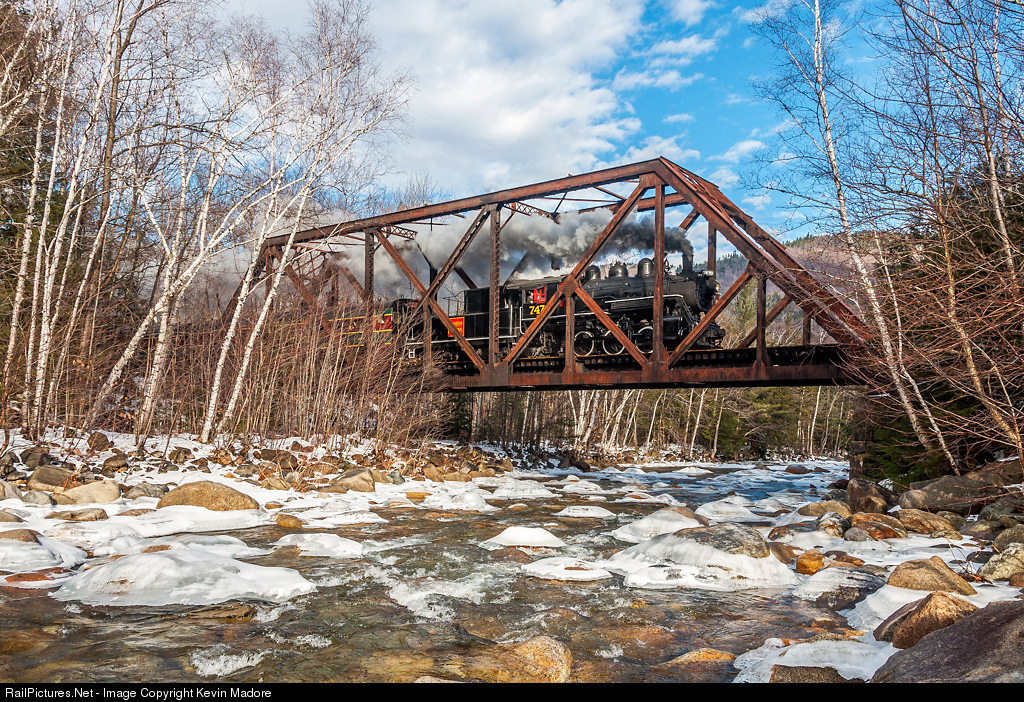 Steam in the Snow - Sawyer River. The Conway Scenic Railroad's 1921-vintage Canadian National Switcher runs eastbound across the Sawyer River with the Mass Bay Railroad Enthusiast's annual "Steam In The Snow" excursion. This train travels the route of the old Maine Central Railroad's Mountain Division, stopping at various sites for photo run-bys to the delight of both the passengers and the local populace. Unlike most years, the weather for the 2011 event was actually quite balmy, with temperatures in the low 40s, generally cloudy skies and not much snow cover. Fortunately, right here by the chilly Sawyer river, there was not only a nice layer of snow and ice remaining, but a timely break in the overcast, just as the train approached!