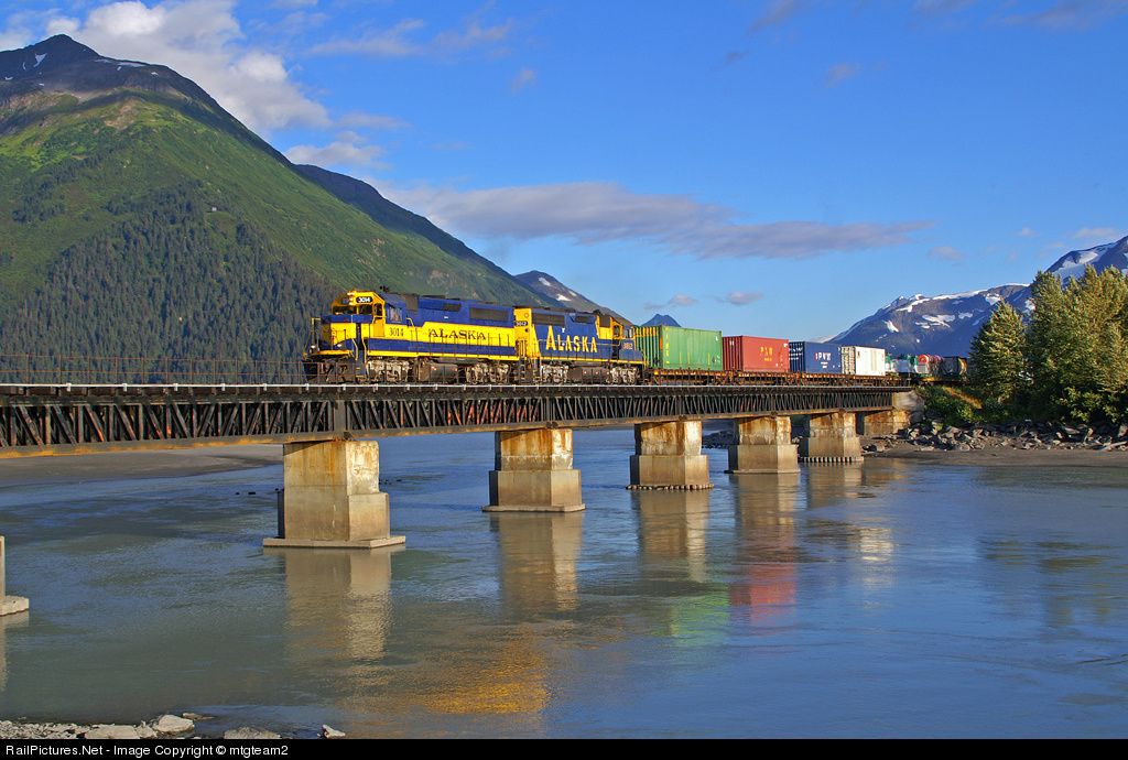 Fresh off the barge Artic Provider an Alaska freight train crosses 20 Mile River on a beautiful fall afternoon. A barge arrives Whittier, AK on a weekly schedule from the lower 48 while another barge from Canada arrives approximately every 10 days providing the 49th state with its interchange to/from the rest of North America.