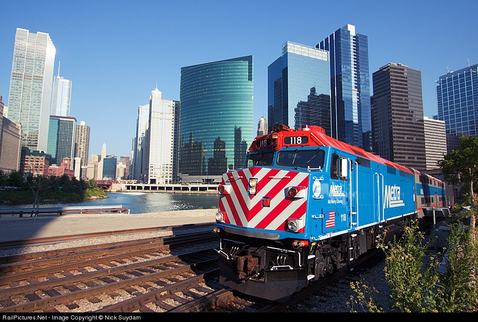 | Just after leaving Chicago Union Station, an outbound Milwaukee Lines Metra train begins to curve across Canal Street with the Chicago River and the city's famous skyline in the background.