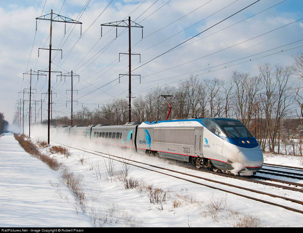 A northbound Acela rolls through Edison after yet another snow storm hits New Jersey. One positive side effect of the storm was the large pile of snow deposited at the end of the NJ Transit commuter parking lot which provided this unique vantage point.