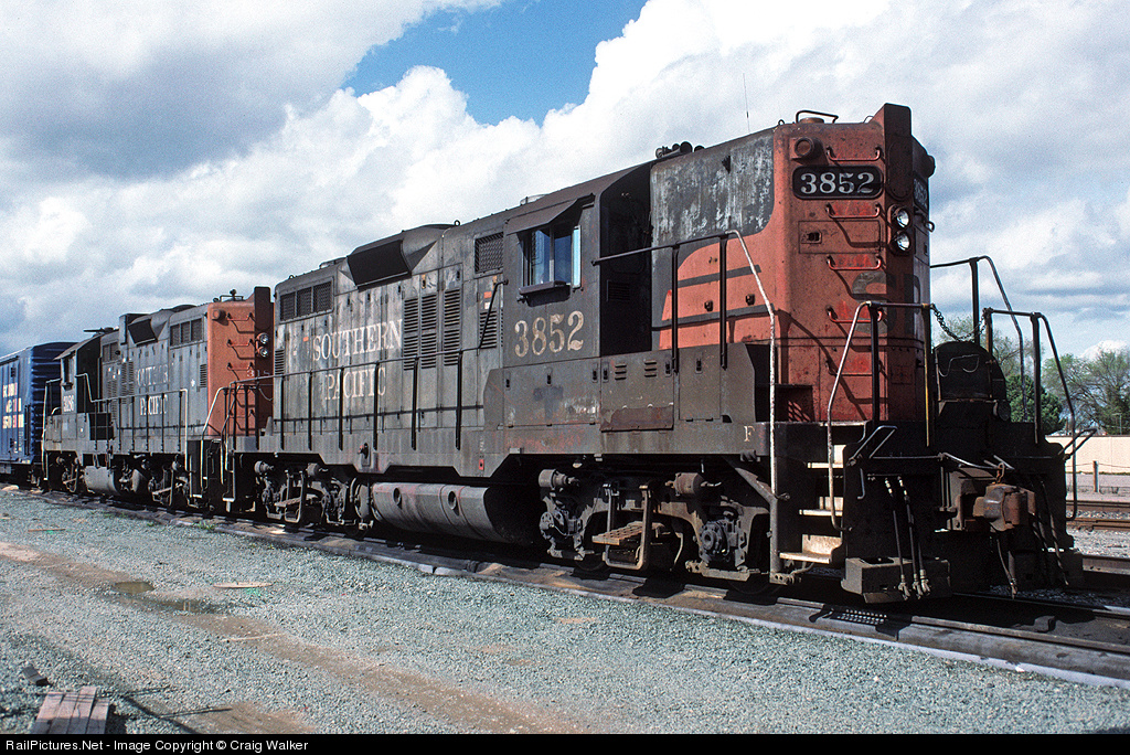 | Southern Pacific GP9 3852 was built by EMD in April 1959 as SP 5826. In the SP's 1965 renumbering scheme, it was assigned number 3689. In July 1977 the engine was released from the railroad's Sacramento upgrade program as number 3852. This engine was sold in February 1996 to Progress Rail. |