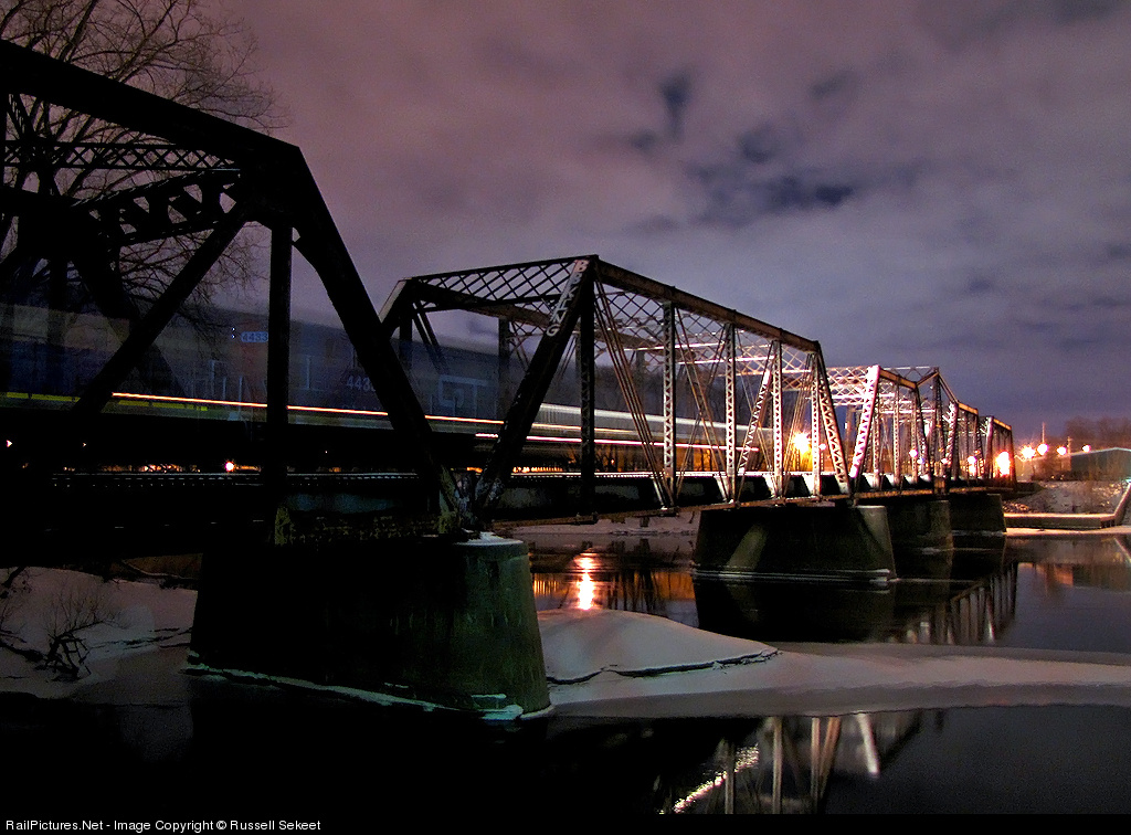 A rare nighttime Z151 crosses the Grand River with an ex GT high nose GP9 in tow.