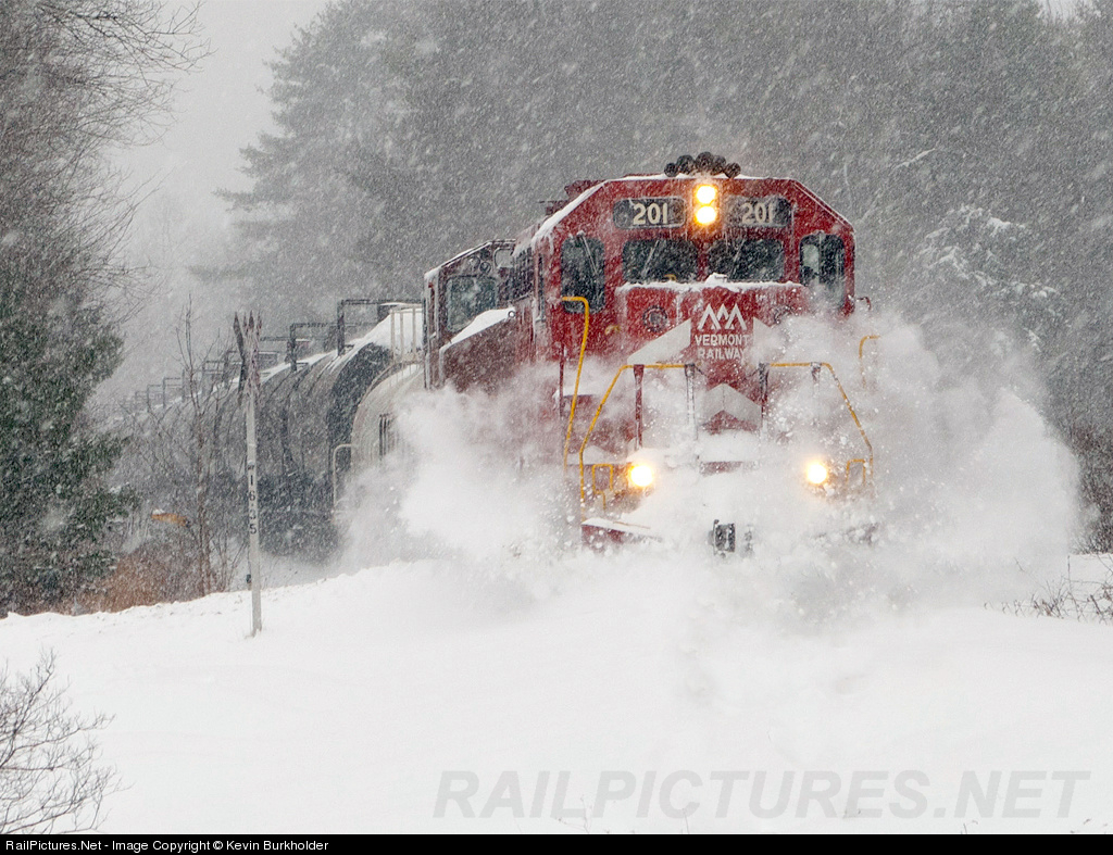 | Rolling upgrade at Baileys Mills, VT, the westbound 4,900' long empty ethanol train is maintaining a steady speed with the assistance of the rear end helper as the VTR GP38-2 201 and GP40-2W 311 push more than 18-24" of newly falling snow out of the way. |