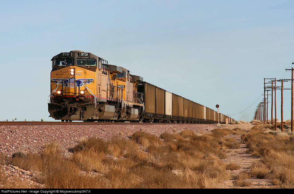 | The second of 2 UP loaded coal trains running on BNSF trackage rights between Barstow and Mojave is seen splitting a pair of old Santa Fe searchlights between Sandborn and Bissell on the Mojave Sub. |