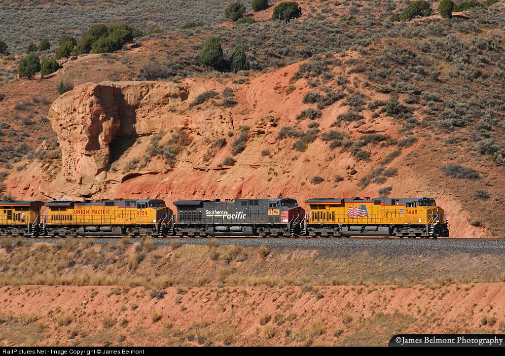One of the joys of railfanning along the Evanston Sub on Friday mornings is the opportunity to catch two Union Pacific perishable trains climbing the Echo Canyon grade. October 1, 2010 was no exception as both the Fresno and Roseville to North Platte trains were called east out of Riverdale (Ogden) that morning. Here a trio of contemporary GE motors climb the grade at Castle Rock. While all three motors appear much the same on the outside, models present include the ES44AC, AC4400CW and C44-9W. The Southern Pacific unit was built the SP 350 in August of 1995 while the UP 9759 was built the Chicago & North Western 8655 in January 1994. The UP 7448 is the junior of the bunch, built new for the Union Pacific in May 2009.