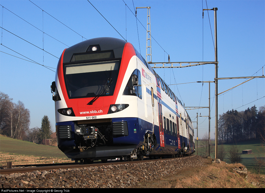 | RABe 511 002, the second of the new 6 car double deck trainsets from StadlerRail for the SBB on a test run Romanshorn-Sulgen. |