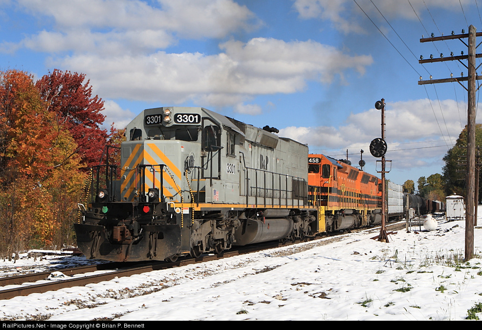 | After being delayed for a few minutes due to signal problems, B&P 3301 finally leads today's BFSI south from downtown Mt. Jewett and notches it up to Run 8 amid the neat contrast of snow on the ground and peak fall foliage. Time is 1112. |