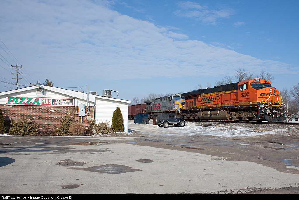 Pizza Time. BNSF 6202 leads ore loads past the local eatery Pizza Plus on its journey south. The second unit, a KCS AC4400CW, is not often seen on the Hannibal Sub.