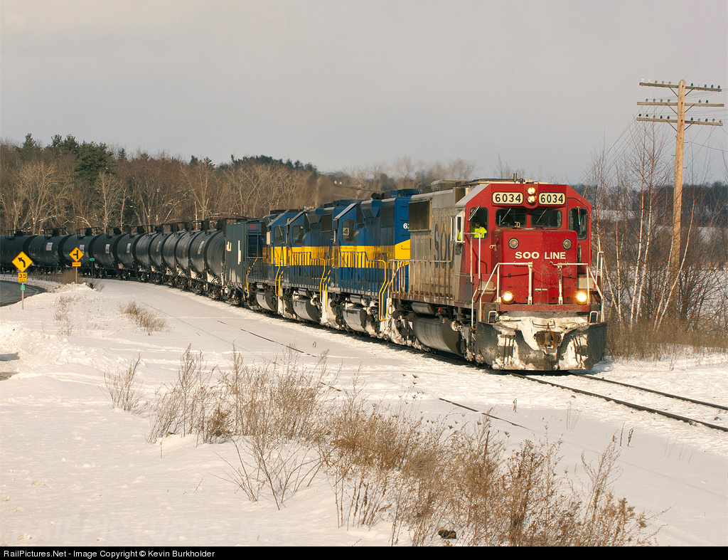 | Holding the main for Amtrak's Northbound Adirondack train to pass, CPR 666-801 is led by SOO SD60 6034 and ICE SD40-2s 6215, 6457 and 6413. |