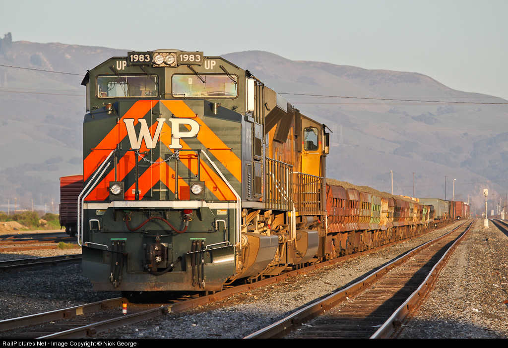 | UP 1983 paid a rare visit to the lonely yard at Watsonville Junction in Pajaro, CA this week. It was on a ballast train and tied down in the yard in this photo. The UP Coast and Santa Barbara Subs are receiving a major track upgrade, and this is one of many trains doing the work. |