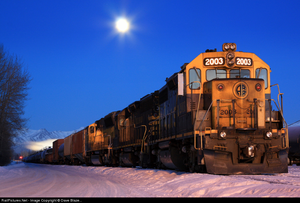| It is one day shy of a full moon on a spectacular clear and cold night in the last frontier. A mixed consist of a GP38-2 a GP40-2 and an SD70MAC sit on the head end of a southbound mixed freight on the "north main" deep within the confines of the ARR’s main classification yard. This train is built and ready to go but won't be called until 0200 the next morning for the run to Whittier and a date with the CN's barge connection from Prince Rupert where she'll strip the barge of the loads and backload the empties seen here for their journey south to the land of the maple leaf. To the east (railroad north) can be seen the small winking red light of the CTC signal at CP 1170 guarding access to the mainline and some low hanging smoke shrouding the lower reaches of the rugged Chugach Mountains. It was only 2 degrees out when I shot this, my first railroad photo of 2011, but I think it was worth braving the elements, don't you? Note: the photographer is a railroad employee with permission to be on the property and was wearing all required PPE while taking this photograph. |