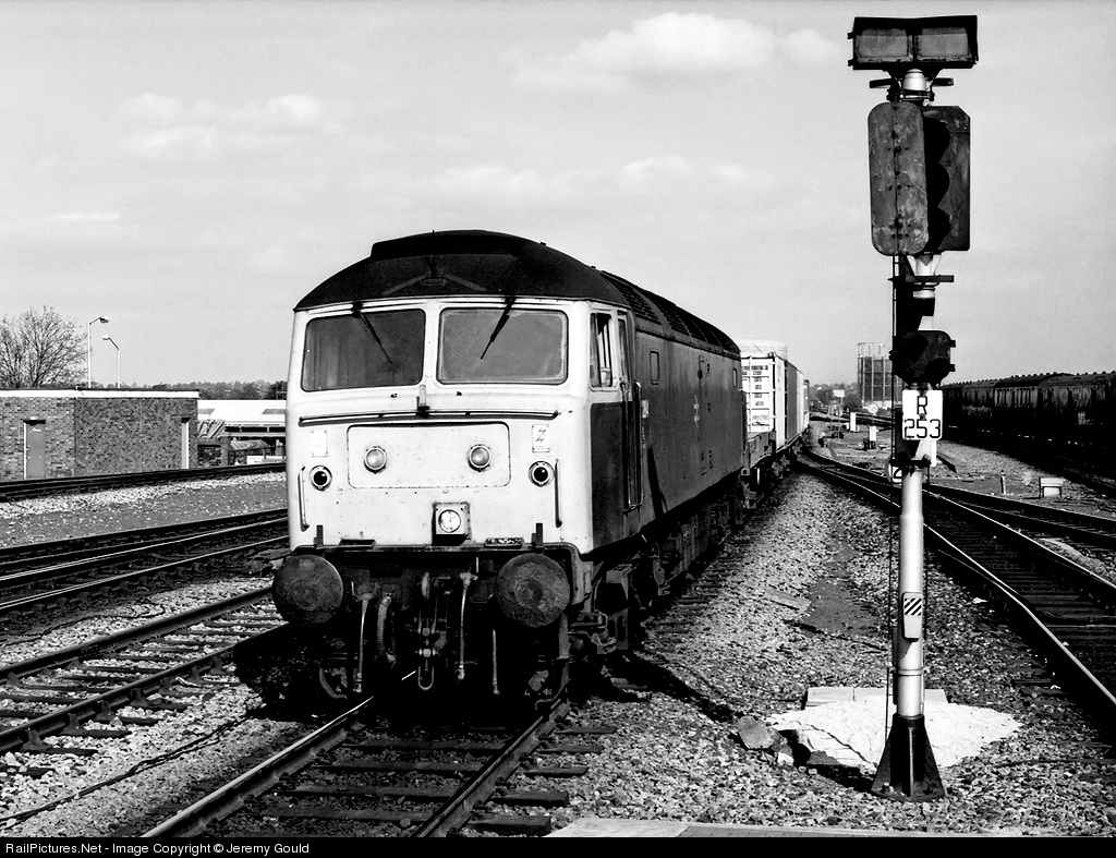 | Tinsley's 47284 heads through Reading with the Ripple Lane to Southampton freightliner. Withdrawn in February 1999, 47284 was cut-up in November the same year at Wigan. Taken on Ilford XP1. |
