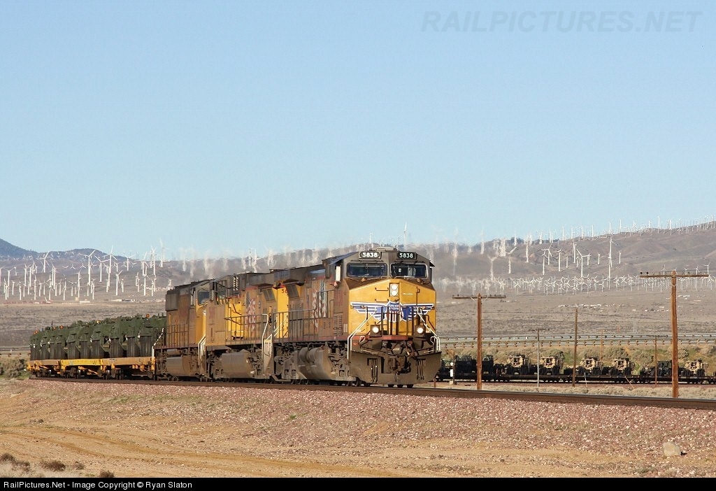 | After it's battle over the Tehachapi's, UP 5838 leads its special onto BNSF's Mojave Sub for the race across the desert to Barstow. The classic windmills that dot the eastern slope of the Tehachapi's can be seen in the distance. |