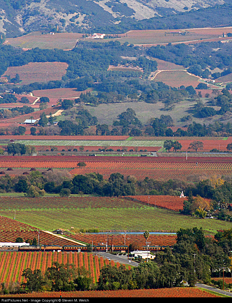 The Northbound leg of the lunch train cruises through the scenic Napa Valley on a stunning Fall afternoon.