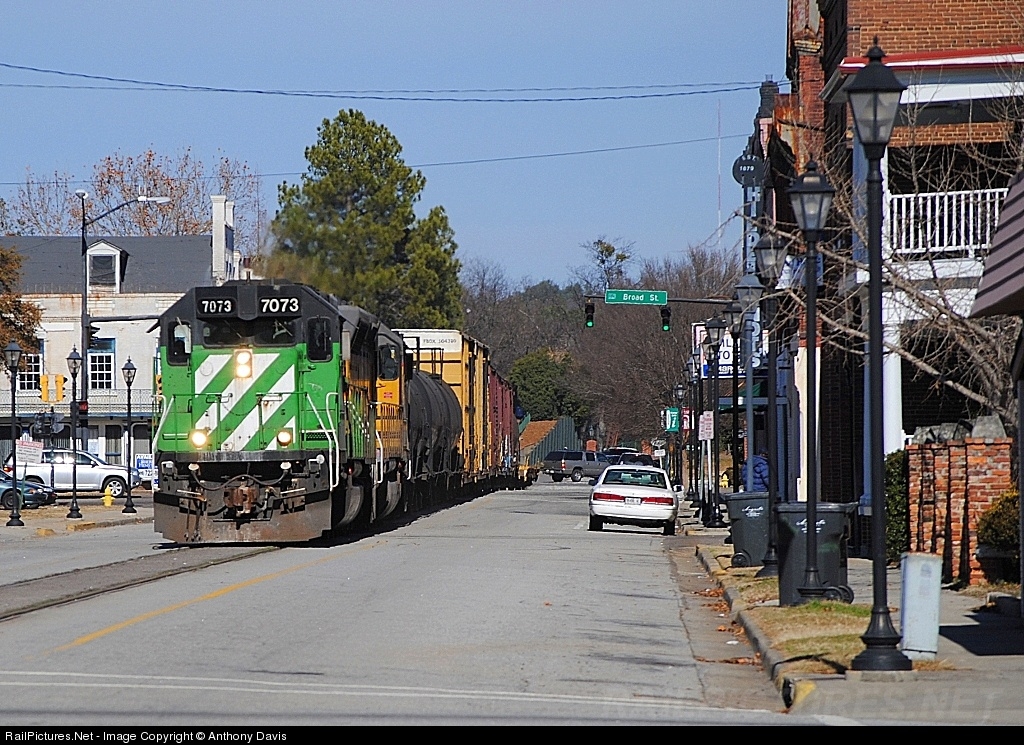 The Finale! Street Running through Augusta! After close to a 90 mile chase from Columbia, South Carolina, back home to Augusta, Georgia, I wrapped up my chase of NS 191 with no other than a shot of it coming down the middle of 6th Street with HLCX 7073, still in Cascade Green (Ex. Burlington Northern, BNSF) SD40-2 with an Ex. Union Pacific, SD45 car body, SD40M-2, CITX 2788 trailing! This was surely a 'Two for One' Special being that I've yet, and never imagined I'd shoot one of these Ex. BN SD40-2s along with the SD45 car body CITX 2788 leading a train in our area, and with the rumors that Norfolk Southern is starting to return some of their leased units called for this trip/chase!