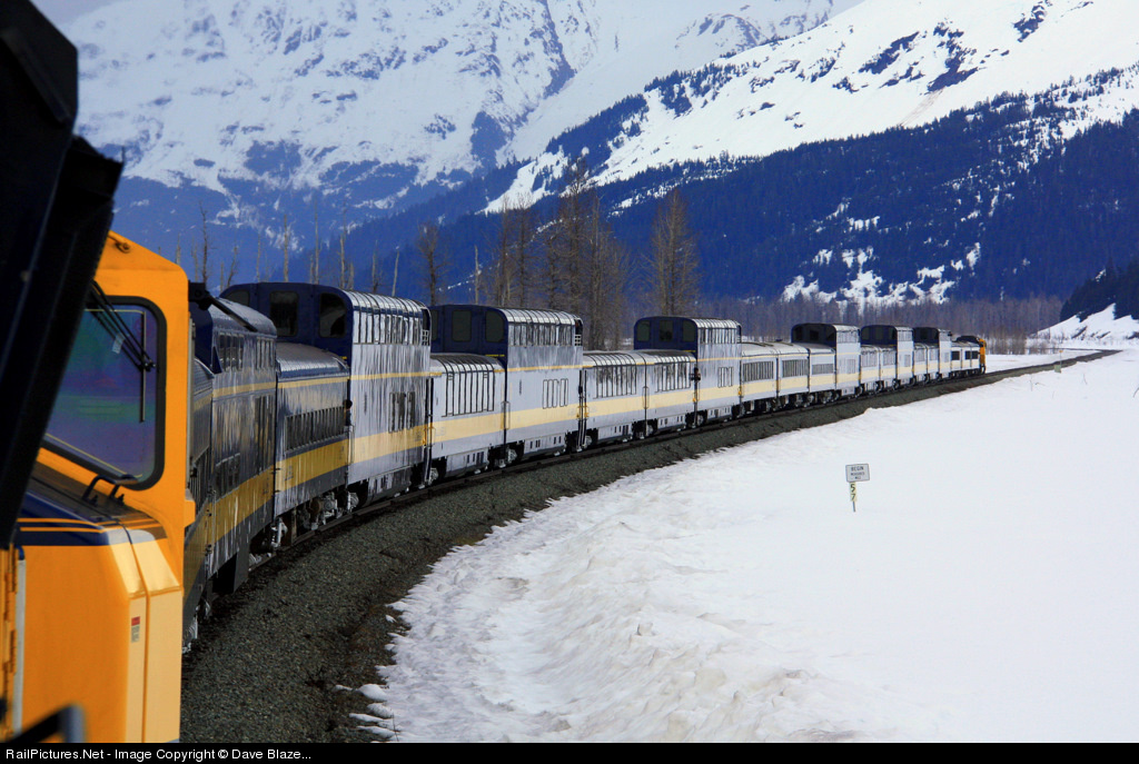 Now this is what I call a passenger train! - Here is a view from the south end of one of the longest passenger trains in recent ARR history. This train consists of 22 cars with two MACs on the south end and one on the north for a total length of just over 2100 ft! Included in the consist were all 6 of ARR's premier double deck Goldstar first class cars as well as vintage former UP "heritage" cars, glass topped single level Colorado Railcar cars, Korean coaches, and a former SP gallery car - quite the motley arrangement. This was a special charter for the IEEE convention that was in town and ran from Anchorage south to Spencer and back in a pull-pull configuration. This view looks railroad north from what was the lead unit but is now the trailing unit after the train reached the south end of its journey at Spencer Glacier and is now racing across the flats of the Placer River valley on the way back to Portage and Anchorage. Note: the photographer is a railroad employee with permission to be on the property and was wearing all required PPE while taking this photograph.