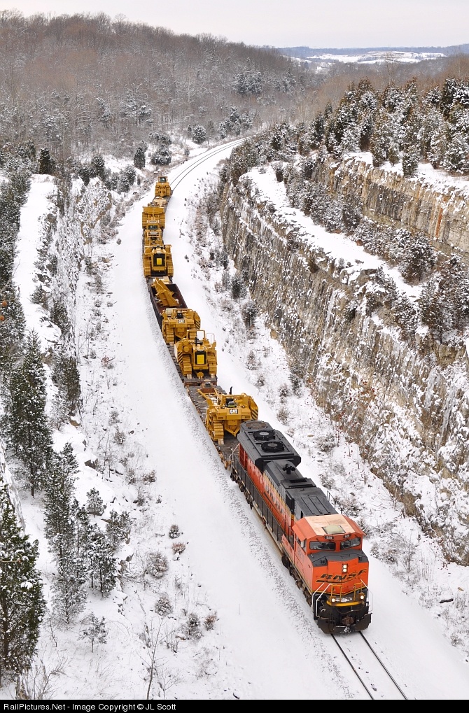 This scene looks like somewhere on the CNO&TP but it's actually magnificent southern Indiana. The Caterpillar move, NS 055, heads east through the big cut at Ramsey, IN as it approaches Louisville. Shot from the Tunnel Hill Road bridge.