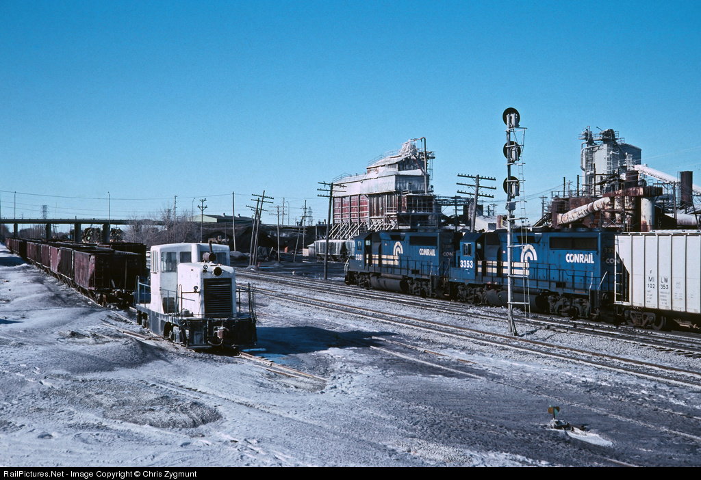 A GE 44 tonner is being used by the Vulcan Material company to switch out offset hoppers. A pair of Conrail GP40-2's run a transfer freight over the IHB.