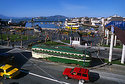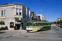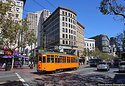An historic Peter Witt tram from Milan, Italy, rattles it's way down Market Street in San Francisco, California.