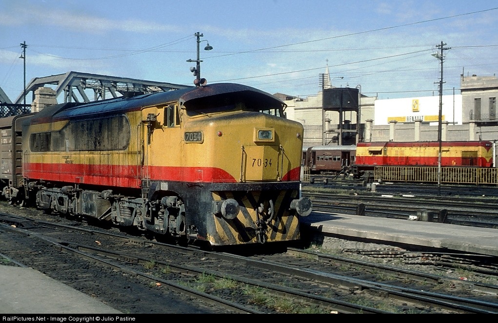 General Roca Railroad's #7034, one of the 51 Baldwin-Lima-Hamilton RF615E's purchased in 1953/1954, completes the run of passenger-train number 128 arriving at Platform 13 of Plaza Constitución Station. Picture angle barely shows the end of the first car of the consist, a box car loaded with parcels. In the background General Electric U13C #6017 waits for its next commuter run to the southern suburbs of Buenos Aires, leading a set of brown coaches like the one just behind her.