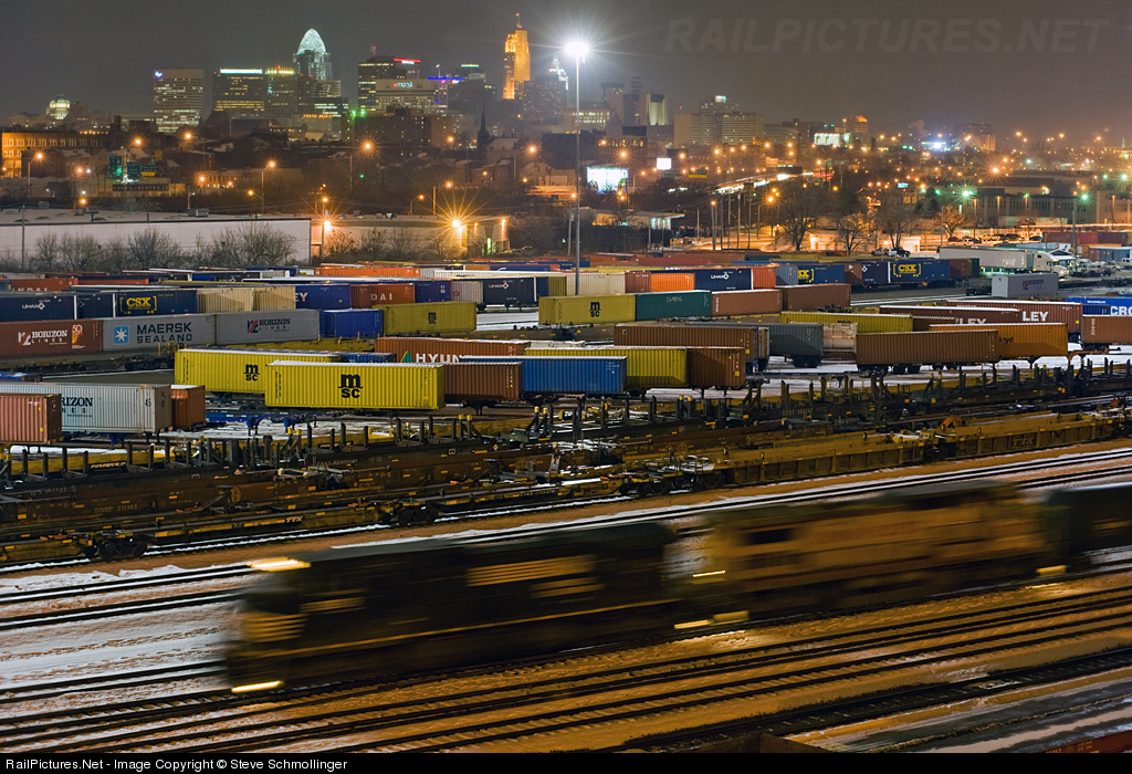 NS 9709 departs Gest Street Yard with CSX's intermodal terminal in the background and the Cincinnati skyline in the distance.