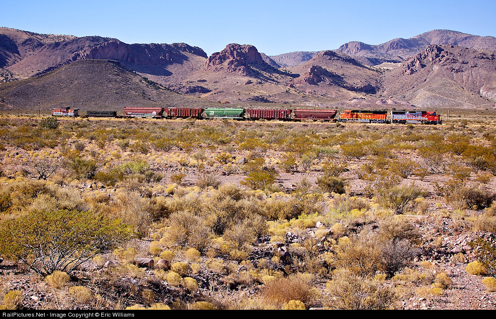 | These former Santa Fe GP60M’s used to tear down the high iron pulling crack inter-modals, but are now down graded for local service. Here a pair is backing about two miles down the remnants of Santa Fe’s Magdalena branch to service the Dicaperi Corp. perlite ore mining operation. This is the last industry located on the original 27 mile branch built to tap into the ore boom. The line beyond the Dicaperi plant was pulled in 1972. |
